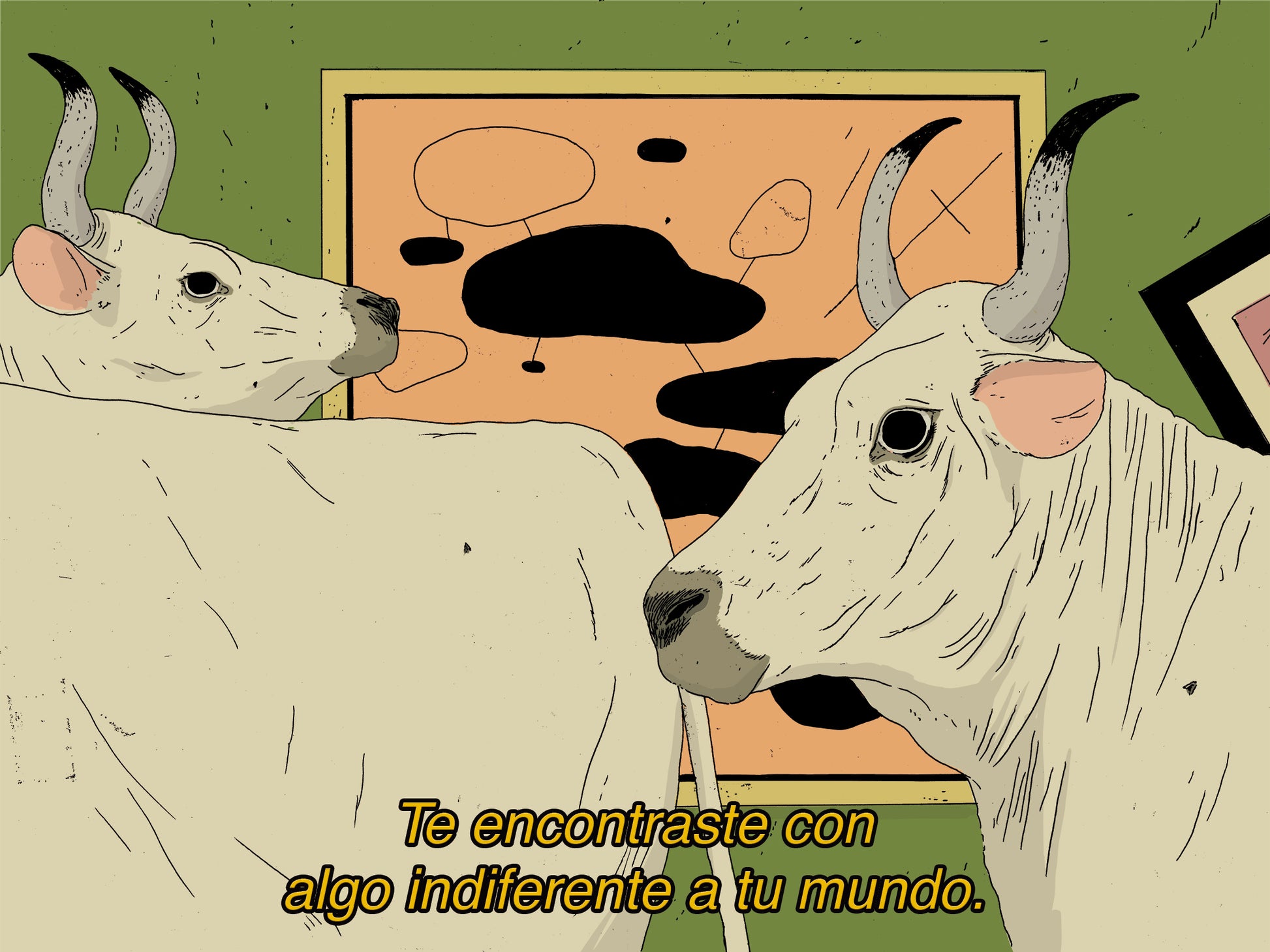 Fotogramas para películas es una serie de ocho ilustraciones en formato mediano que fusionan dos pasiones: los animales y el cine. Estas piezas nacen del interés por los fotogramas de películas compartidos en redes sociales, los cuales capturan fragmentos narrativos de una manera que antes del internet era poco común. Al extraer la temporalidad del medio cinematográfico, estos fotogramas se convierten en detonantes narrativos, invitando al espectador a imaginar las historias ficticias que habitan en ellos. Los subtítulos, presentes en las ilustraciones con una estética nostálgica de los años 90 y 2000, refuerzan esta conexión, evocando el acto de descubrir cine en idiomas desconocidos.